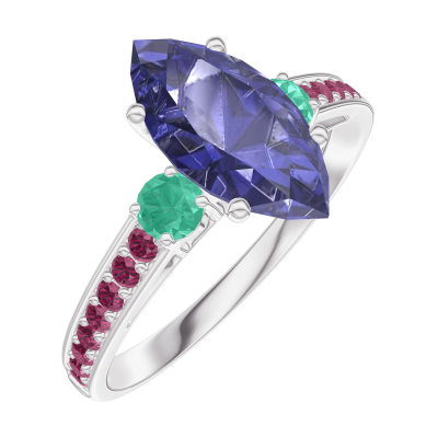 « L'ATELIER » NR. 168992Inel Aur alb 9 carate - Safir albastru Marquise 1 carate - Pietre laterale Smarald - Încrustare Rubin