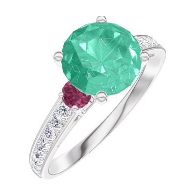 « L'ATELIER » Nº169048Inel Aur alb 9 carate - Smarald rotund 1 carate - Pietre laterale Rubin - Încrustare Diamant 4.8