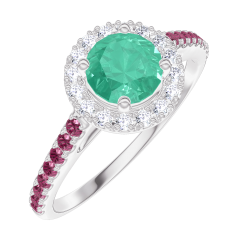 Inel Aur alb 18 carate - Smarald rotund 0.5 carate - Halo Diamant - Încrustare Rubin