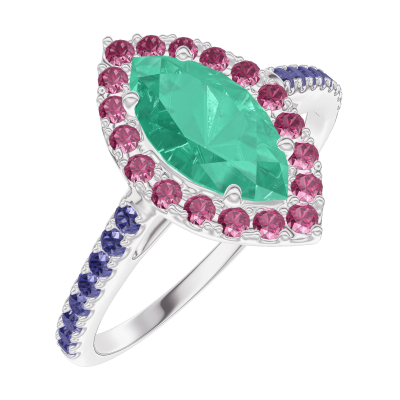 « L'ATELIER » Nº171135Inel Aur alb 18 carate - Smarald Marquise 0.5 carate - Halo Rubin - Încrustare Safir albastru