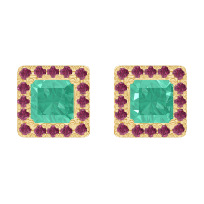 « L'ATELIER » Nº201369Cercei Aur galben 18 carate - Smarald Princess 0.3 carate (2 X) - Halo Rubin