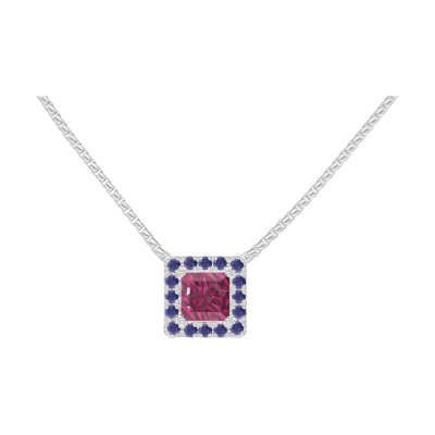 « L'ATELIER » Nº201887Colier Aur alb 18 carate - Rubin Princess 0.3 carate - Halo Safir albastru - Lanţ Veneţian