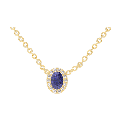 « L'ATELIER » NR. 202122Colier Aur galben 9 carate - Safir albastru Oval 0.3 carate - Halo Diamant - Lanţ Zale