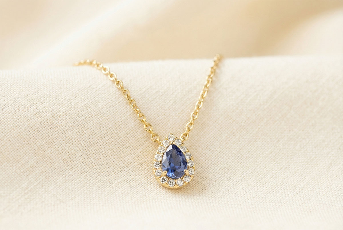 « L'ATELIER » NR. 202153Colier Aur galben 18 carate - Safir albastru Pară 0.3 carate - Halo Diamant - Lanţ Zale