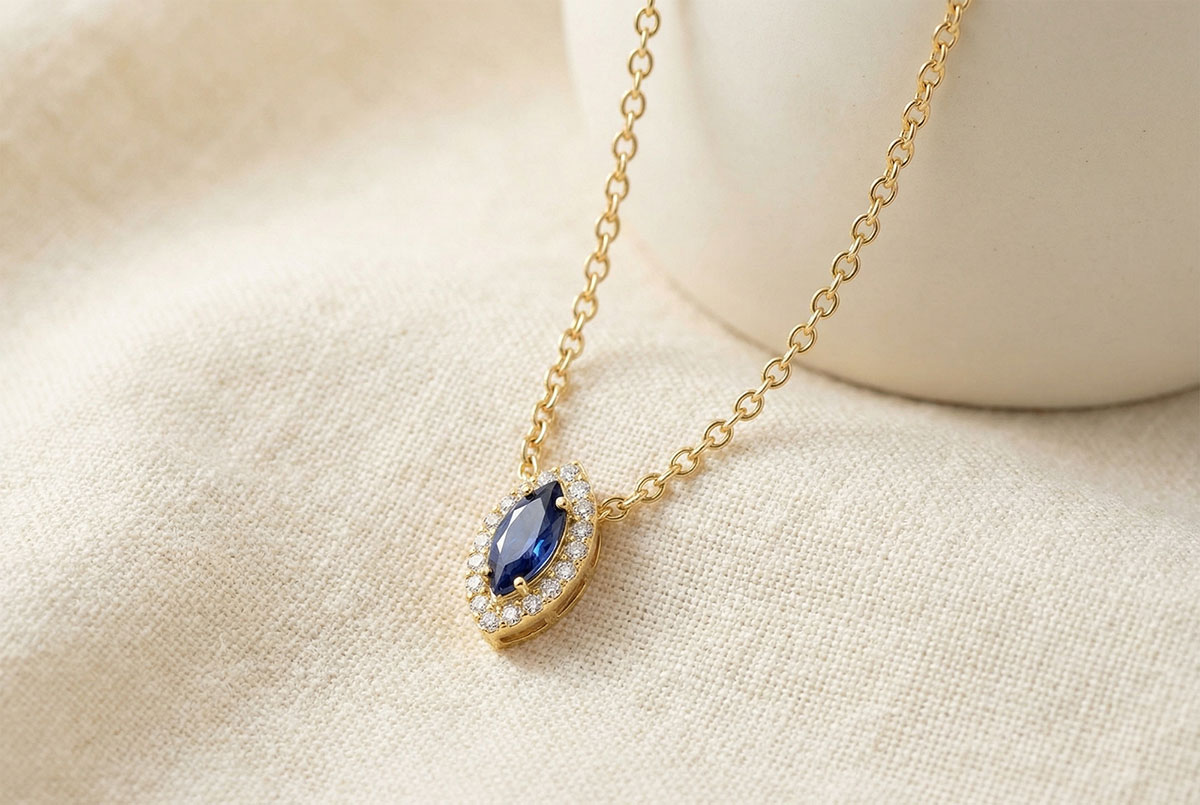 « L'ATELIER » NR. 202186Colier Aur galben 9 carate - Safir albastru Marquise 0.3 carate - Halo Diamant - Lanţ Zale