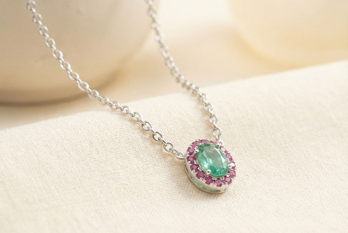 « L'ATELIER » NR. 202323Colier Aur alb 18 carate - Smarald Oval 0.3 carate - Halo Rubin - Lanţ Zale