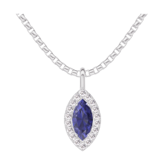 Pandantiv Aur alb 18 carate - Safir albastru Marquise 0.3 carate - Halo Diamant - Lanţ Veneţian