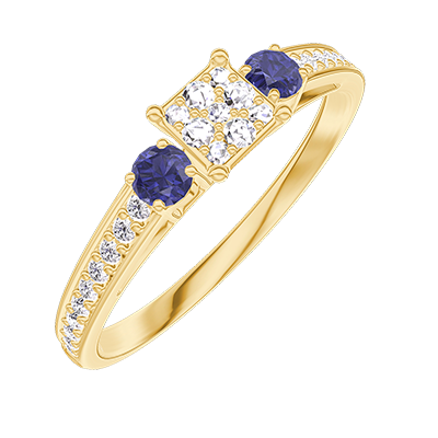 « L'ATELIER » NR. 209166Inel Aur galben 9 carate - Cluster de diamante naturale Princess echivalent 0.3 - Pietre laterale Safir albastru - Încrustare Diamant