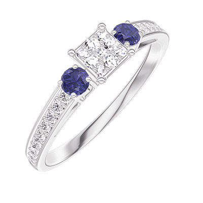 « L'ATELIER » NR. 209167Inel Aur alb 18 carate - Cluster de diamante naturale Princess echivalent 0.3 - Pietre laterale Safir albastru - Încrustare Diamant