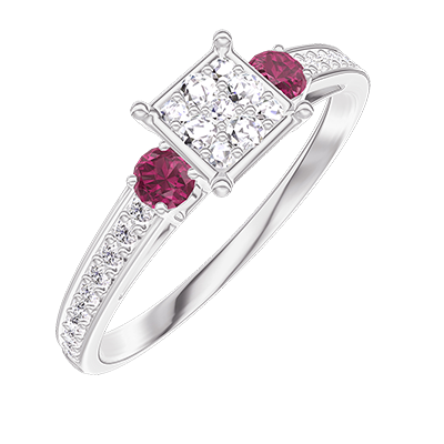 « L'ATELIER » NR. 209748Inel Aur alb 9 carate - Cluster de diamante naturale Princess echivalent 0.5 - Pietre laterale Rubin - Încrustare Diamant