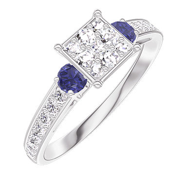 « L'ATELIER » NR. 210368Inel Aur alb 9 carate - Cluster de diamante naturale Princess echivalent 0.7 - Pietre laterale Safir albastru - Încrustare Diamant