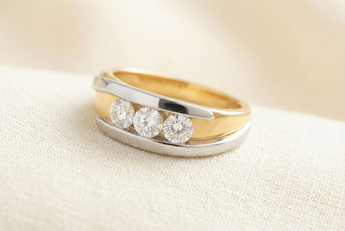 O montură sobră şi clasică asociată forţei îmbinării celor două nuanţe de aur: galben şi alb, pentru a sublinia cu delicateţe trilogia de diamante.