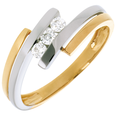 O trilogie de diamante ce încadrează două inele din aur galben-aur alb, într-un inel feminin şi delicat.