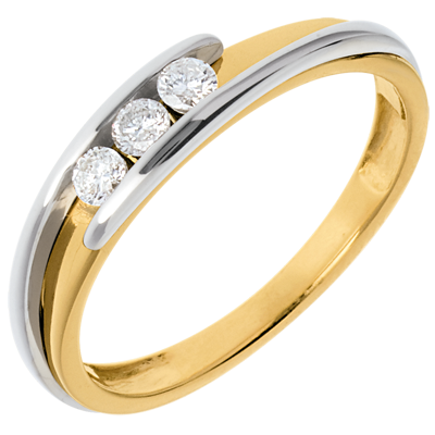 O montură sobră şi clasică asociată forţei îmbinării celor două nuanţe de aur: galben şi alb, pentru a sublinia cu delicateţe trilogia de diamante.