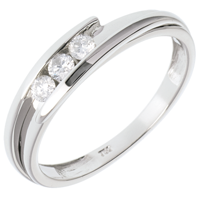 O montură sobră şi clasică subliniată de un inel dublu uşor întredeschis asupra unei trilogii de diamante.