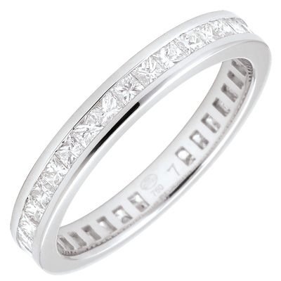 Echilibrul perfect al unui inel din aur alb pavat cu diamante princess setate bară, pentru o simbolică puternică. O bijuterie esenţială pentru o legătură de excepţie.