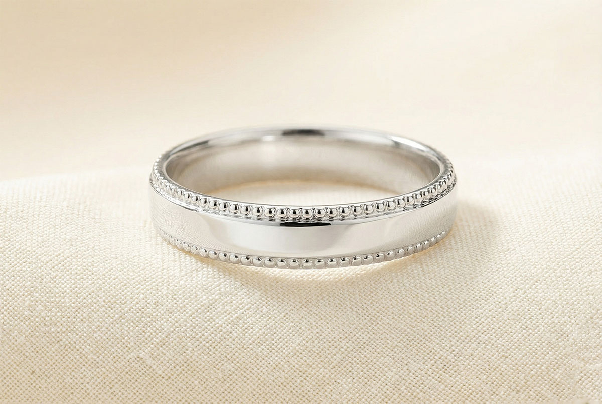 o verighetă din aur alb cu un motiv gravat pentru a-i oferi un maxim de strălucire.
