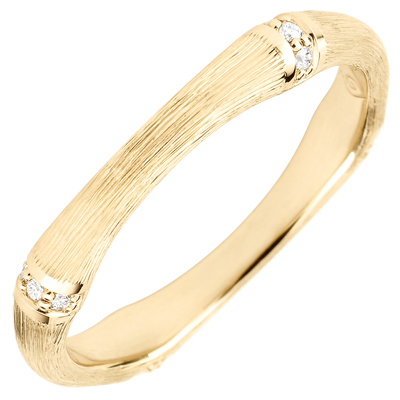 O tulpină de bambus suplă şi totuşi solidă se metamorfozează într-un inel etern din aur galben cu lustru periat, încrustat cu diamante. Finisarea mată realizată manual îi oferă un aspect natural de un realism surprinzător.
