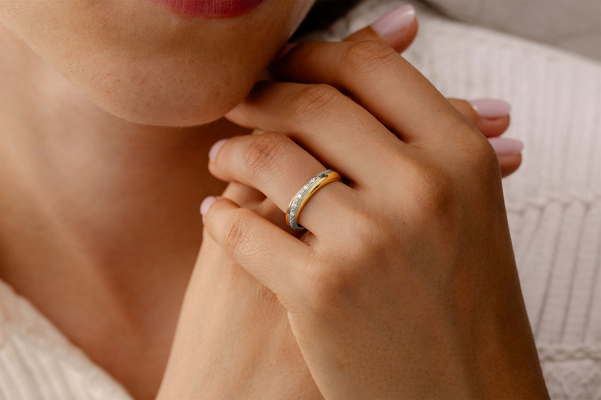 Amestecul echilibrat a trei nuanţe de aur: alb, galben şi roz, subliniat de un pavaj de diamante pentru o verighetă unică şi atemporală.