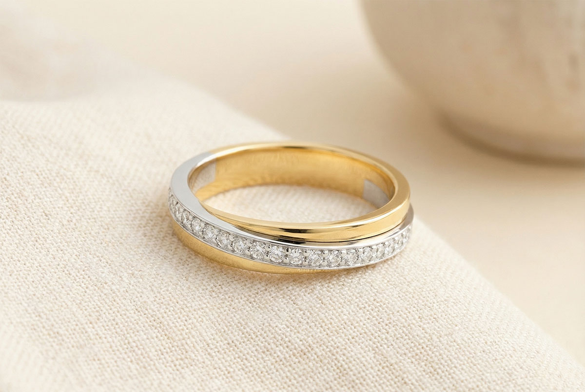 O verighetă din aur galben îmbrăţişată de o arcadă de aur alb pavată cu diamante - setate bară.