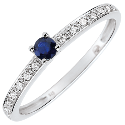 Un inel de logodnă elegant şi clasic din aur alb ce are încrustat cu 4 gheruţe un safir solitaire fiind însoţit şi de diamante laterale.