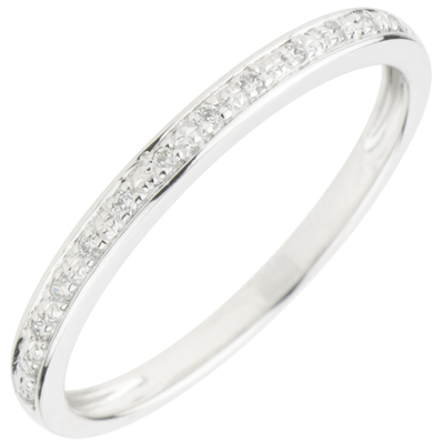 O verighetă din aur alb cu diamante încrustate grăunte, elegantă şi atemporală. Această verighetă de căsătorie este ideală în însoţirea unui inel de logodnă sau la fel de bine, se poate purta singură.