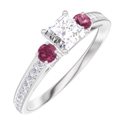 « L'ATELIER » NR. 160148Inel Aur alb 9 carate - Diamant Princess 0.3 carate - Pietre laterale Rubin - Încrustare Diamant