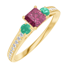 Inel Aur galben 18 carate - Rubin Princess 0.3 carate - Pietre laterale Smarald - Încrustare Diamant
