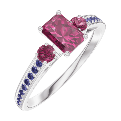 « L'ATELIER » NR. 160856Inel Aur alb 9 carate - Rubin Smarald 0.3 carate - Pietre laterale Rubin - Încrustare Safir albastru