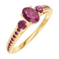 Inel Aur galben 9 carate - Rubin Oval 0.3 carate - Pietre laterale Rubin - Încrustare Rubin