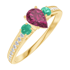 Inel Aur galben 18 carate - Rubin Pară 0.3 carate - Pietre laterale Smarald - Încrustare Diamant