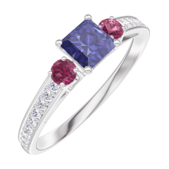 Inel Aur alb 9 carate - Safir albastru Princess 0.3 carate - Pietre laterale Rubin - Încrustare Diamant