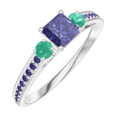 Inel Aur alb 18 carate - Safir albastru Princess 0.3 carate - Pietre laterale Smarald - Încrustare Safir albastru