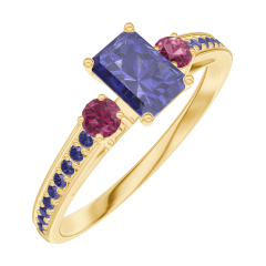 Inel Aur galben 18 carate - Safir albastru Smarald 0.3 carate - Pietre laterale Rubin - Încrustare Safir albastru