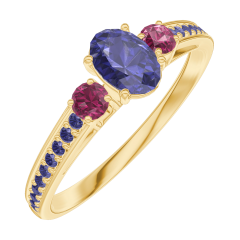 Inel Aur galben 18 carate - Safir albastru Oval 0.3 carate - Pietre laterale Rubin - Încrustare Safir albastru