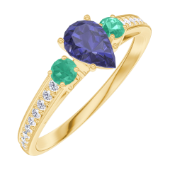 Inel Aur galben 9 carate - Safir albastru Pară 0.3 carate - Pietre laterale Smarald - Încrustare Diamant