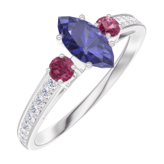 Inel Aur alb 9 carate - Safir albastru Marquise 0.3 carate - Pietre laterale Rubin - Încrustare Diamant