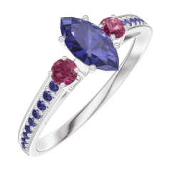 Inel Aur alb 9 carate - Safir albastru Marquise 0.3 carate - Pietre laterale Rubin - Încrustare Safir albastru