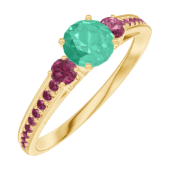 Inel Aur galben 18 carate - Smarald rotund 0.3 carate - Pietre laterale Rubin - Încrustare Rubin