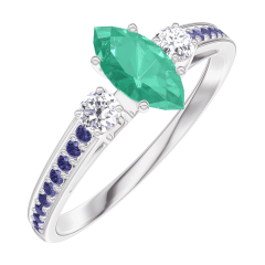 Inel Aur alb 18 carate - Smarald Marquise 0.3 carate - Pietre laterale Diamant - Încrustare Safir albastru