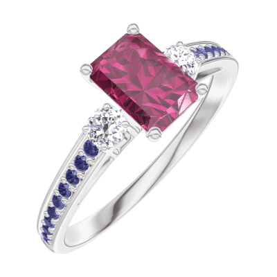 « L'ATELIER » Nº163235Inel Aur alb 18 carate - Rubin Smarald 0.5 carate - Pietre laterale Diamant - Încrustare Safir albastru