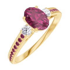 Inel Aur galben 9 carate - Rubin Oval 0.5 carate - Pietre laterale Diamant - Încrustare Rubin
