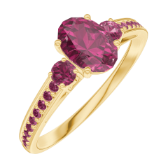 Inel Aur galben 9 carate - Rubin Oval 0.5 carate - Pietre laterale Rubin - Încrustare Rubin