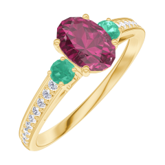 Inel Aur galben 18 carate - Rubin Oval 0.5 carate - Pietre laterale Smarald - Încrustare Diamant