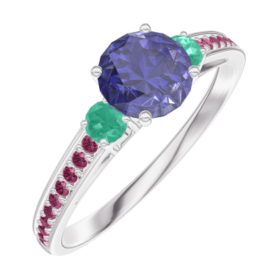« L'ATELIER » Nº163691Inel Aur alb 18 carate - Safir albastru rotund 0.5 carate - Pietre laterale Smarald - Încrustare Rubin 4.8