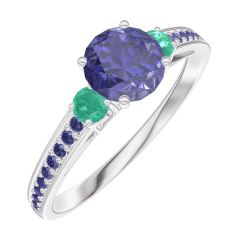 Inel Aur alb 18 carate - Safir albastru rotund 0.5 carate - Pietre laterale Smarald - Încrustare Safir albastru