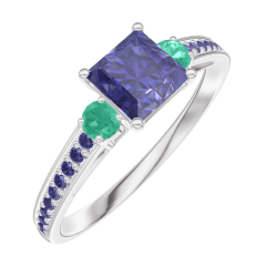 Inel Aur alb 9 carate - Safir albastru Princess 0.5 carate - Pietre laterale Smarald - Încrustare Safir albastru