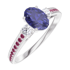 Inel Aur alb 18 carate - Safir albastru Oval 0.5 carate - Pietre laterale Diamant - Încrustare Rubin