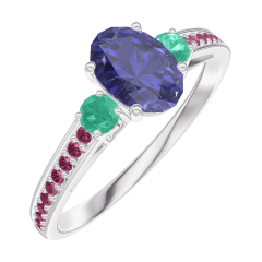 Inel Aur alb 18 carate - Safir albastru Oval 0.5 carate - Pietre laterale Smarald - Încrustare Rubin