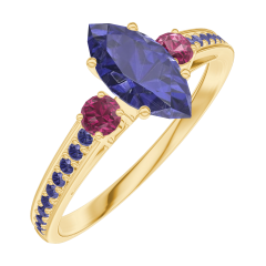 Inel Aur galben 18 carate - Safir albastru Marquise 0.5 carate - Pietre laterale Rubin - Încrustare Safir albastru